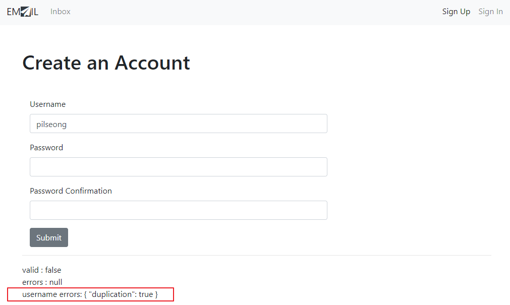 3. 이번에는 비동기식 검증이다. 지정한 username이 사용중인지를 확인하는 경우다.