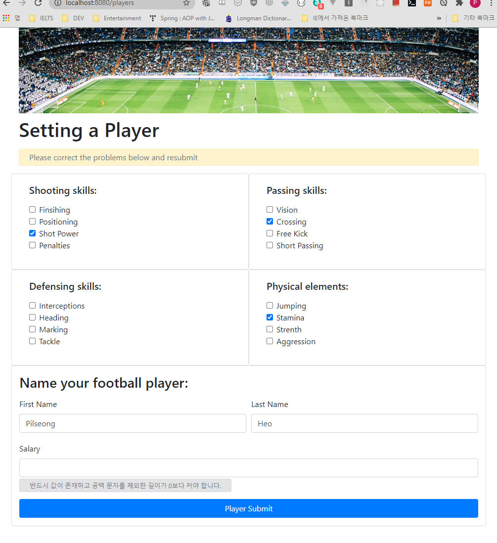 Spring Boot : JDBC를 이용한 FootBall Club example 3. 선수 등록 검증로직 작성