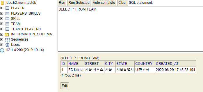 4-2 팀을 하나 만들고 등록한 데이터베이스 결과