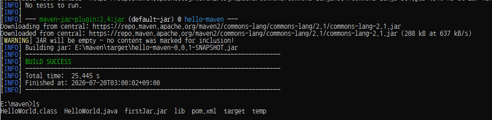 1-2 폴더에 파일을 복사하고 mvn package를 실행하면 기본적인 메이븐과 관련된 파일이 자동으로 다운로드 된다.