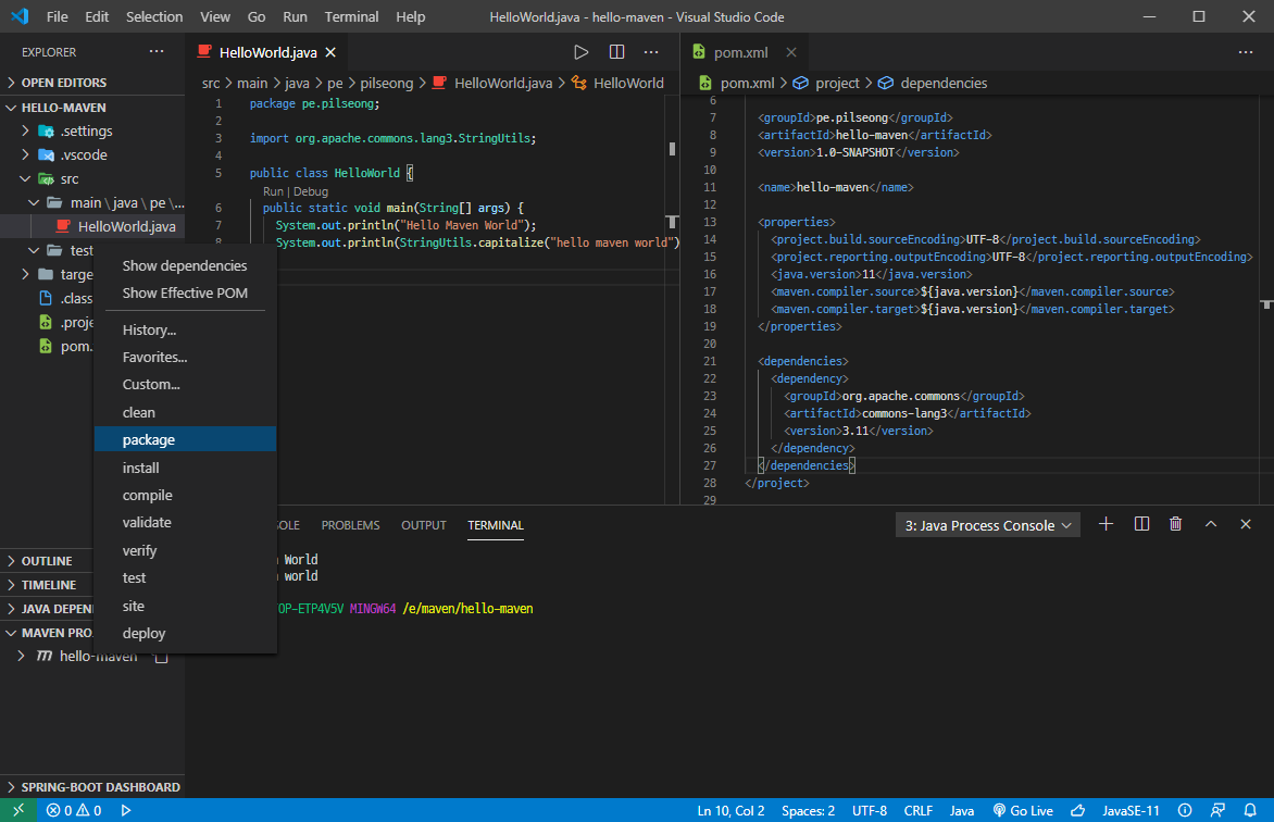 5. 빌드를 하려면 Maven Projects에 나오는 maven 항목에 오른 버튼 누르고 package를 만들면 된다.