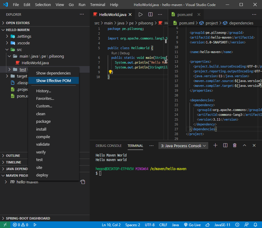 3. 최종적으로 사용되는 상속을 모두 반영한 POM을 effective POM이라고 하고 아래처럼 생성할 수 있다.