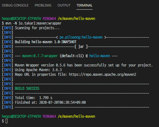 2. 이 wrapper를 만드는 방법은 mvn plugin의 goal을 실행하는 것인데 아래처럼 실행하면 된다.