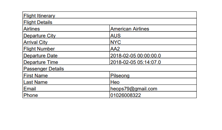 2-1. 아래의 예제는 예약한 항공티켓 관련 정보를 PDF로 출력하는 기능이다.