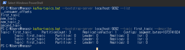 2-2-0 우선 토픽의 정보를 확인한다. first_topic은 아래처럼 3개의 파티션이 있음을 알 수 있다.