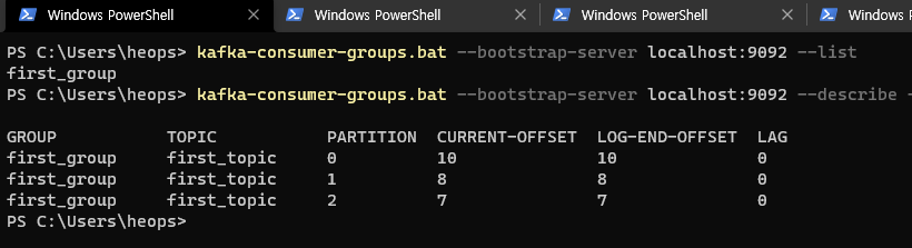 2-2 현재 컨슈머 그룹은 first_group 하나만 존재함을 --list 옵션으로 알 수 있고