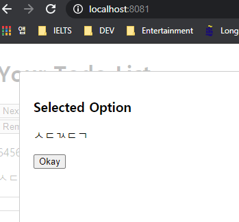 5-1 Next Todo? 버튼을 눌렀을 때 아래와 같이 Modal이 표출되고 선택된 내용이 화면에 나오게 된다.