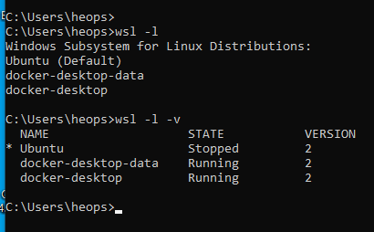 2-0 우선 모든 Distro의 상태를 Stop으로 변경해야 한다. Docker를 shutdown한다. wsl을 옮길 때도 종료한다.