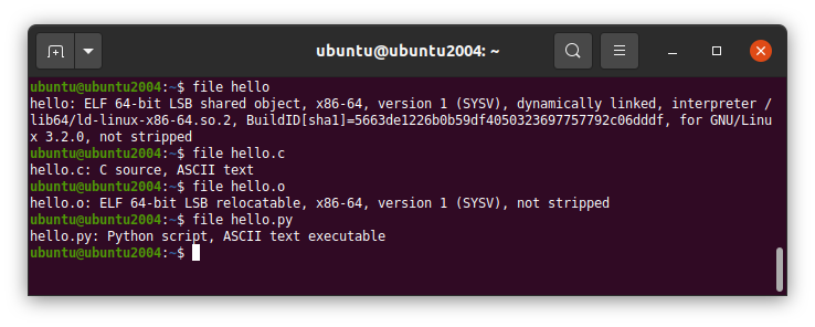 1-6-1 아래는 hello 실행파일, 소스코드, object 파일, python 소스코드에 대한 정보를 보여주고 있다.