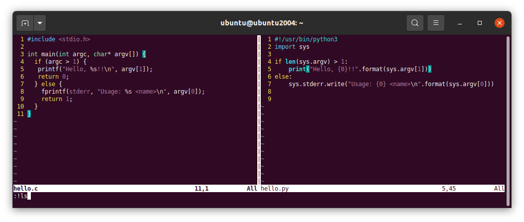 1-4-4 c프로그램을 컴파일 할 때 :!gcc % -o hello 를 사용하면 hello 실행 파일이 만들어 진다.