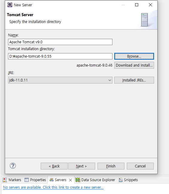 5. 이클립스에 tomcat을 등록한다. 그냥 하면 된다. 등록할 때 톰캣과 JDK의 위치를 지정해 줘야 한다.