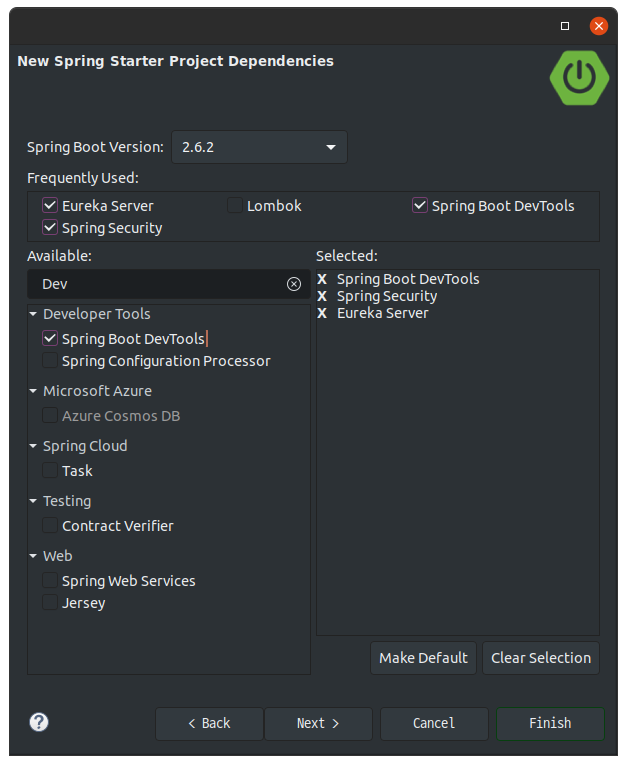 1-2 기본 스타터는 유레카 서버만 있으면 된다. 유레카 데시보드의 접근제어를 위해서 Spring secure를 적용했다.