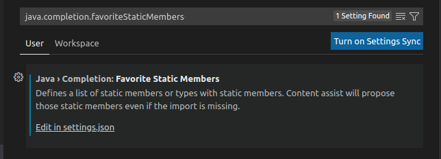 Edit in settings.json으로 해당항목을 보면 아래처럼 열리는데 Code 기본적으로 org.junit.Assert.* 패키지를 기본으로 보여주기 때문에 assertJ 패키지를 import하기가 상당히 까다롭다. 아래처럼 해당항목을 assertj를 추가하고 junit을 주석처리하면