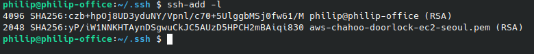 4-1 ssh-add -l을 사용하면 어떤 인증서가 등록되어 있는지 간단히 확인할 수 있다. 아래의 경우 2개의 인증서가 등록되어 있다.