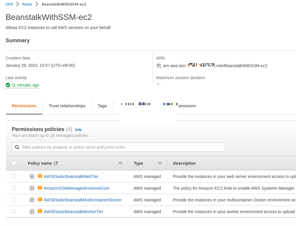 2-1 아래의 role은 aws-elasticbeanstalk-ec2-role 기본 role에 AmazonSSMManagedInstanceCore를 추가한 롤이다.