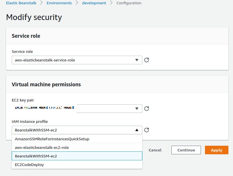 3. 만든 ROLE을 Elastic Beanstalk 환경 설정에 넣어 준다.