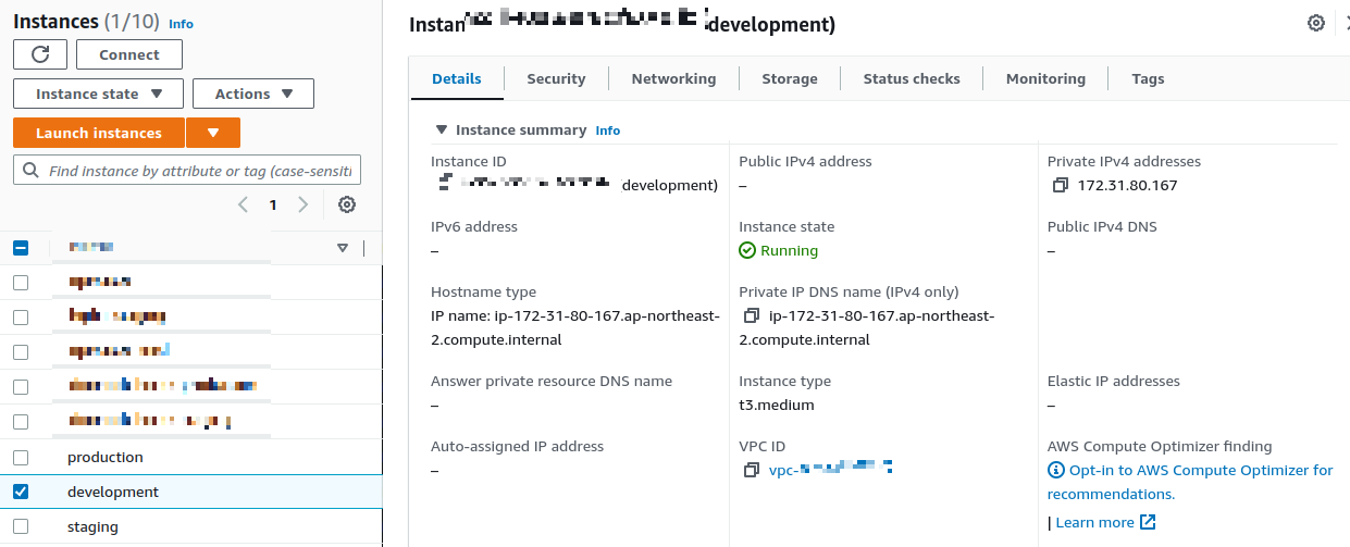 7. 아래가 EC2 정보인데 public IP가 없는 것을 확인할 수 있다. 즉 private subnet에 있어도 이 방식으로 접근이 가능하다는 의미다.