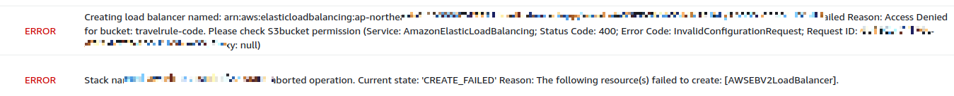 2. 생성시 아래와 같이 빈스토크 환경이 제대로 생성되지 않는다. ALB 생성이 실패했는데 보면 S3 버킷에 대한 권한이 없기 때문이다.