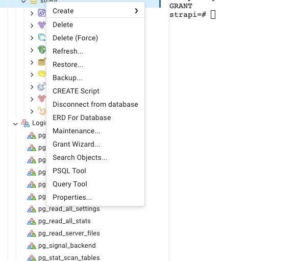 $ CREATE USER strapi WITH PASSWORD 'strapi';