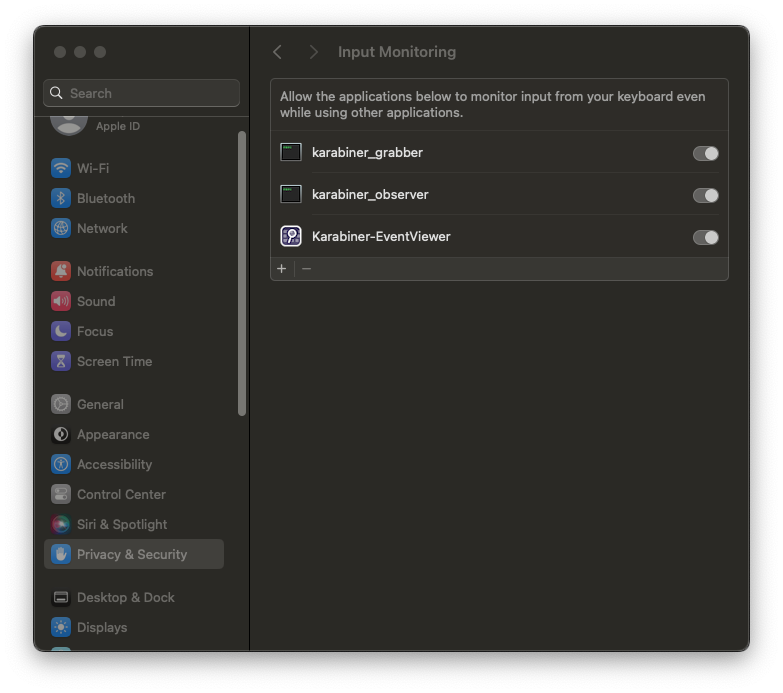 2-2 두번째는 설치 시 패키지에 함께 설치된 프로그램에게 입력 모니터링 권한을 부여하는 것인데, 설정 후 아래처럼 나오면 된다.