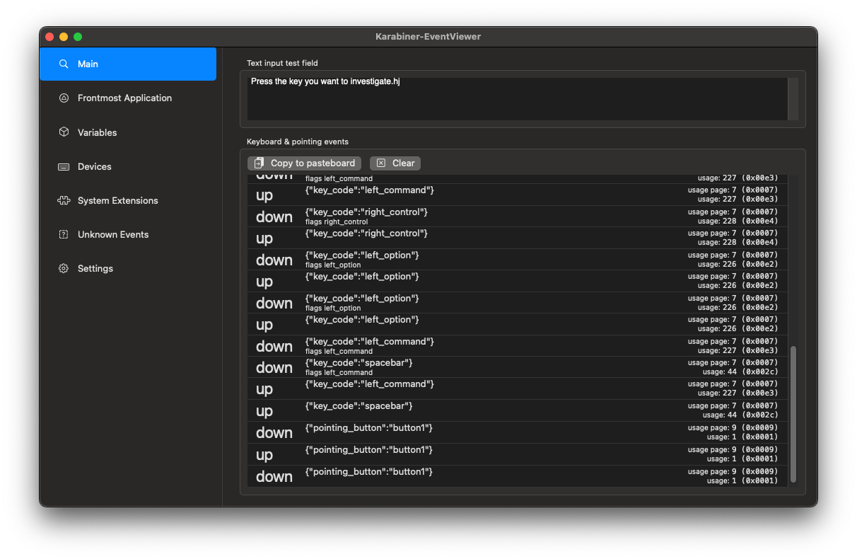 3. 이제 매핑을 해야하는데 매핑을 하려면 지금 누르는 키가 뭔지를 알아야 한다. 이때 사용하는 것이 위의 캡처의 Karabinder-EventViewer이다. 설치시 이것도 같이 설치된다. 이것을 열어서 키를 눌러보면 어떤 키가 입력되는지 알 수 있다.