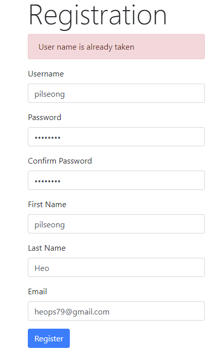 3-1 현재는 그냥 중복 유저이름일 경우 그냥 registration-form을 돌아가도록 되어 있다.